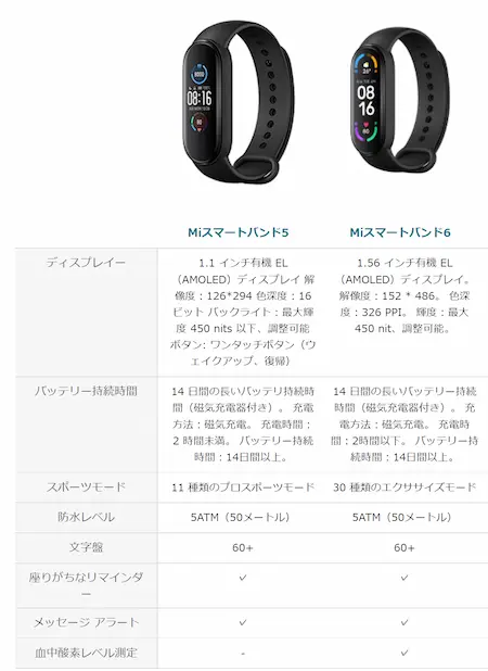 上記画像が、5 vs 6 の性能比較表になるのですが、スマートバンド6の成長点として、