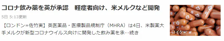 アメリカのメルク社がコロナ向けにて飲み薬を開発しました。
