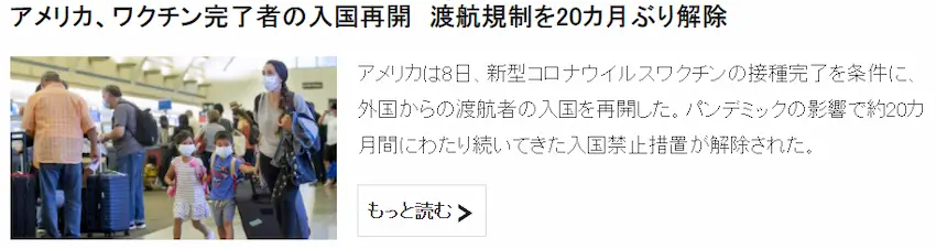 最近のNEWSでは、ワクチン完了者のアメリカの入国開始が始まったようです。