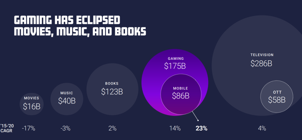 上記の円グラフは、各コンテンツにおける市場の2015~20年における成長率をしめしたものになります。MOVIEを見ると、やはり-16%という形で市場の売上高規模がさがってきてしまっております。こちらは、NETFLIXなどが、インターネットにて映画の代替となるコンテンツを生み出した結果、売り上げが下がったと思われます。これはNETFLIXがMOVIEの業界を破壊したといっても過言ではないです。また、GAMINGの業界をみると、どんどん成長していっていることがわかります。GAMINGの市場のなかでもMOBILE向けの市場はすばらしく、23%毎年市場成長が見込まれす。ここでトーナメントや、コンペティションの運営の覇権を握れば、市場成長すればするほどスキルズが勝手に成長していくことになります。