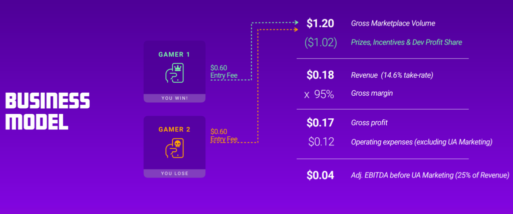 ここでスキルズが公開しているビジネスモデルの例にてご説明いたします。アプリの運営者がコンペティションを開いて、登録料が0.6$だっとします。集まるお金は1.2$になりますね。そして、賞金は上記の緑色の1.02$になります。これは、勝者に渡される賞金、ならびにAPP開発者へのFeeも込みだとおもわれます。そしてスキルズが0.18$を運営費としていただくことになります。パーセンテージとしますと、スキルズは運営費として15%を徴収しているかたちになります。なんかすっごい高く感じるのですが、気のせいでしょうか。笑 会社としてはとてもいいビジネスだと思います。