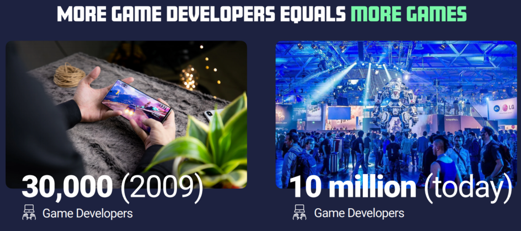 今は昔と違って、努力すれば自分でゲームが開発できる環境になりました。2009年は、30000人程度のゲームクリエイターしかいんかったのが、2021年には10,000,000人のゲームクリエイターがいる世界になっています。340倍ですって。すごいですね。市場の増加にともなう、製品コンテンツの増加もすごいです。インディーで有名なゲームといえばUndartaleとかりますよね。このように一般の人も積極的にゲーム開発、そしてそのゲームを提供できるようになっています。ただ、ゲーム開発とそのオンライン対戦における運営はむずかしいですよね。スキルズはその市場を狙っていて覇権を取りに行く準備をしています。ここから新しいゲームが出れば出るほど、スキルズの未来は明るくなっていきと思います。