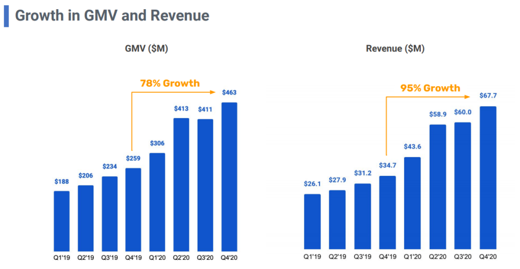 売上高はYoYにて95%の成長。GMVも78%成長と、すばらしい右肩あがりとなっております。