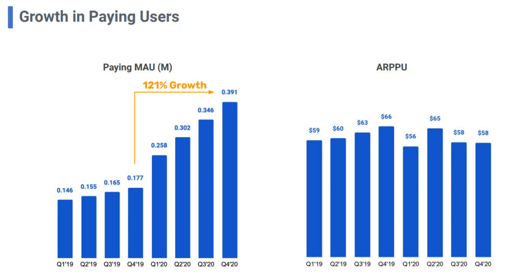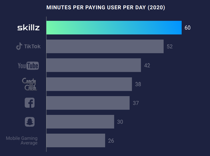 上のグラフは有料ユーザー一人あたり1日における使用時間になります。Tik TokやYouTubeといった有名な他者にも劣らず、一日あたりでしようされている時間が長いのがスキルズになります。競合性の高いコンペティションを提供しているため、必然的に使用時間も伸びるとおもっておりますが、各アプリケーションよりも一番使用時間がながいのはさすがというべきです。
