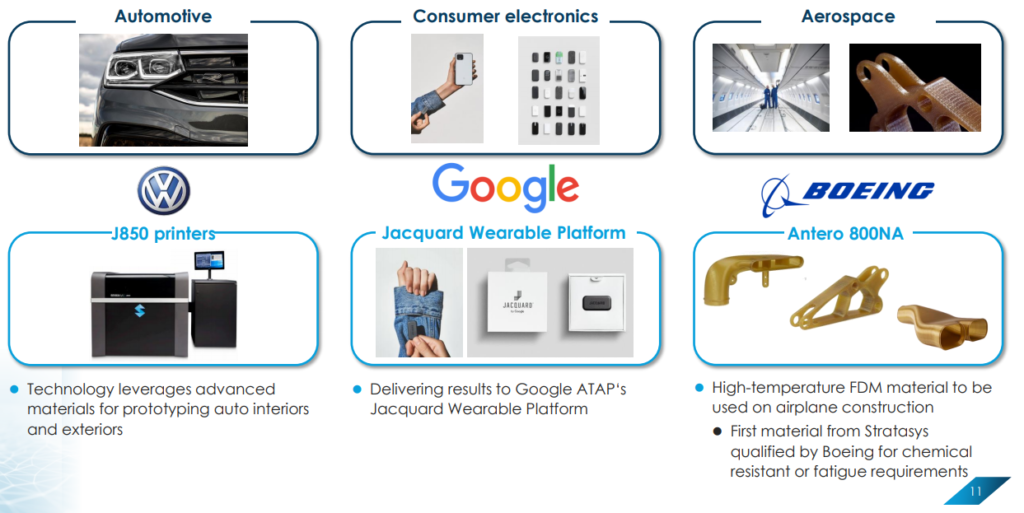 • 航空宇宙: 航空機の製造に使用される高温FDM材料の提供、ボーイング社が耐薬品性や疲労の要件を満たすと認定した、ストラタシス初の材料