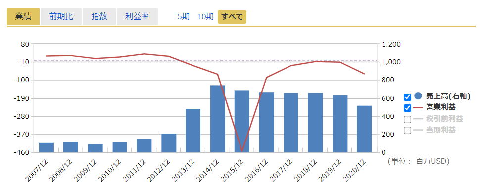 営業利益もまだマイナスのままですし、さらに売上高が2014年からピークにて下がってきているのが、悲しいです