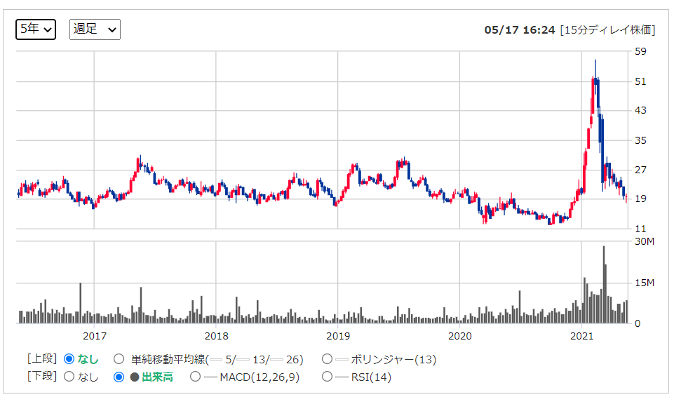 現在の株価は5月16日時点で、19$付近をうろうろしております。2021年1月から下げている理由になりますが、こちらは、グロース株が白熱しておりまして、完全な割高水準になっていたため、みんなが落ち着いてきたというのが私の意見です。